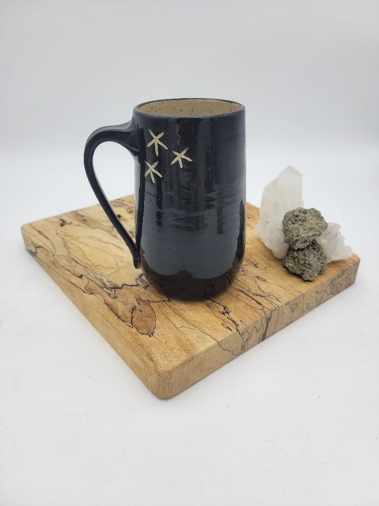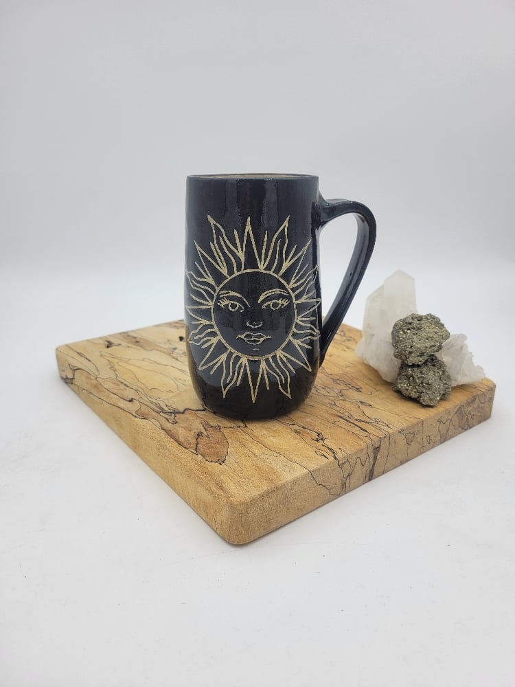 Handcrafted Black and Tan Sun Mug, holds approx 18oz. Microwave and dishwasher safe.