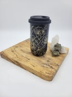 Handcrafted Black and Tan Cosmo travel Mug, holds approx 20 oz. Microwave and dishwasher safe. Comes with Silicone Lid.