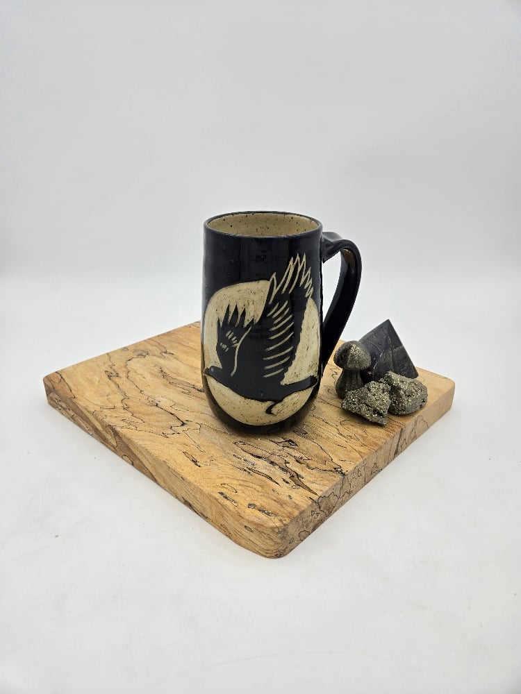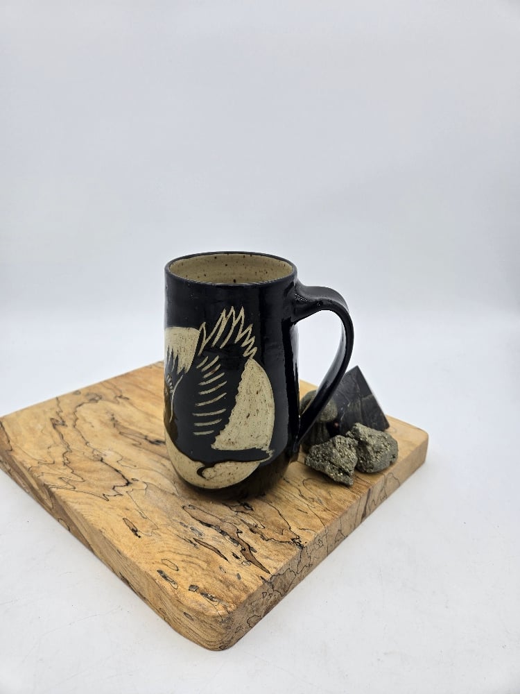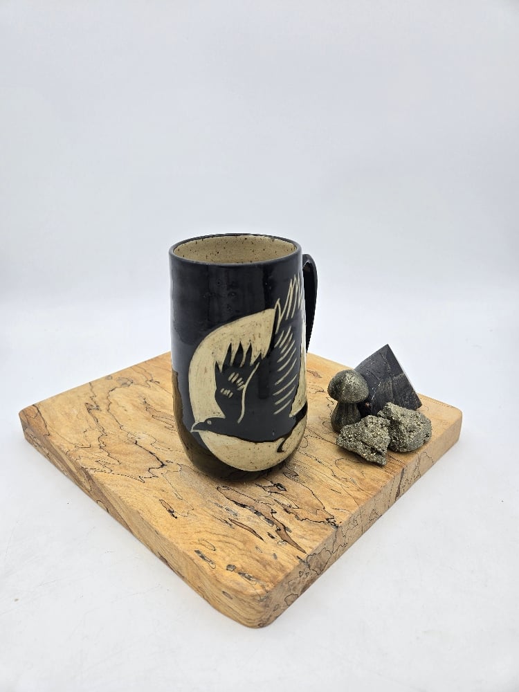 Handcrafted Black and Tan full moon crow mug. Holds approx 18oz, microwave and dishwasher safe.