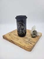 Handcrafted Black and Tan Moon Face Mug, holds approx 20 oz. Microwave and dishwasher safe. Comes with Silicone Lid.