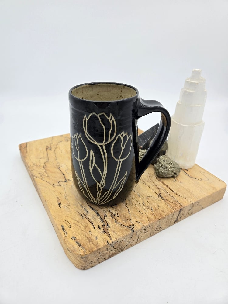 Handcrafted Black and Tan Tulip Mug, holds approx 18oz. Microwave and dishwasher safe.