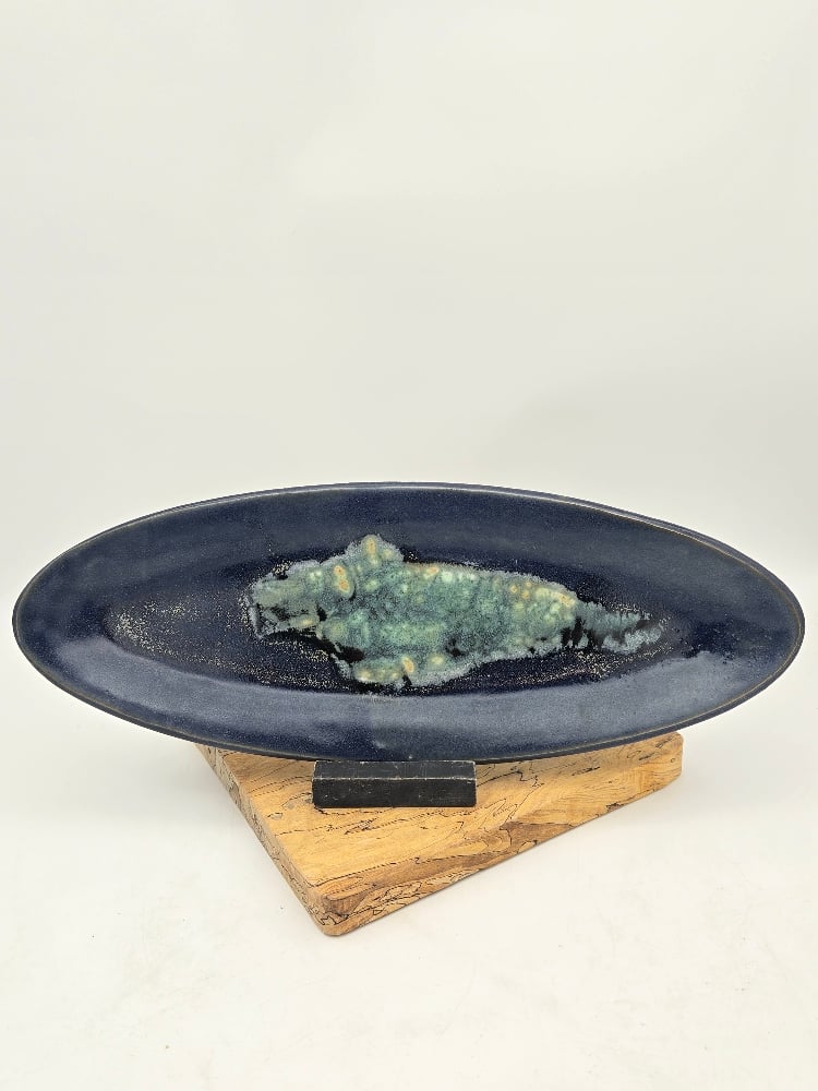 Handcrafted Blue Drip platter, approx 19 inches long and 7 inches wide. Microwave and dishwasher safe.