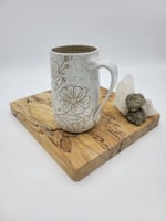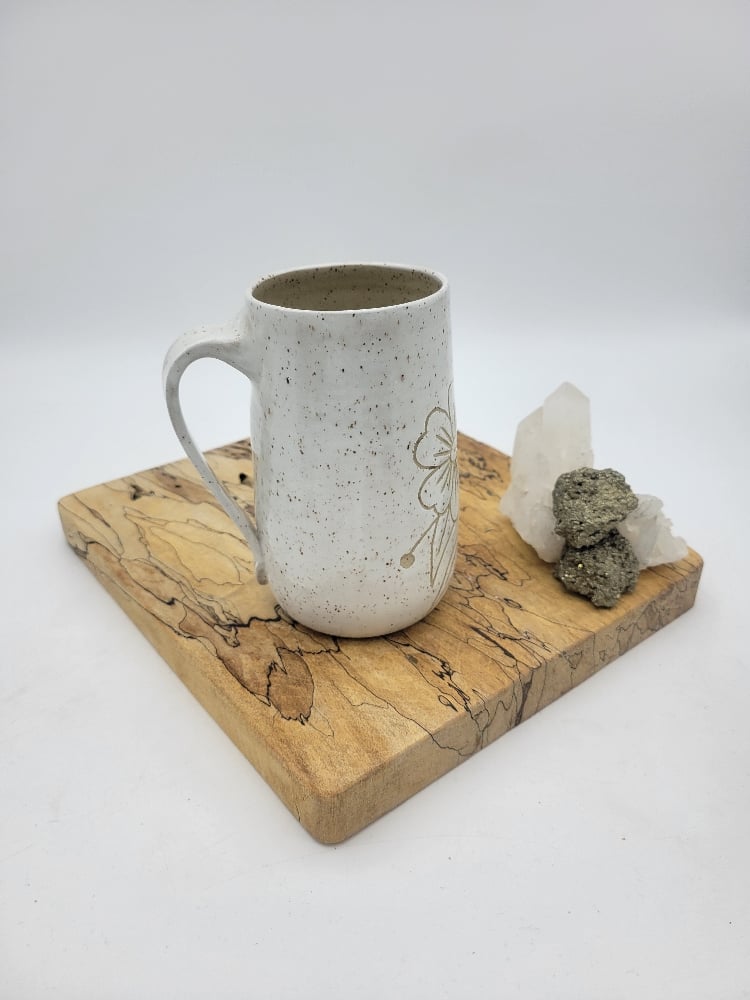 Handcrafted White and Tan Cosmo Flower Mug, holds approx 18oz. Microwave and dishwasher safe.