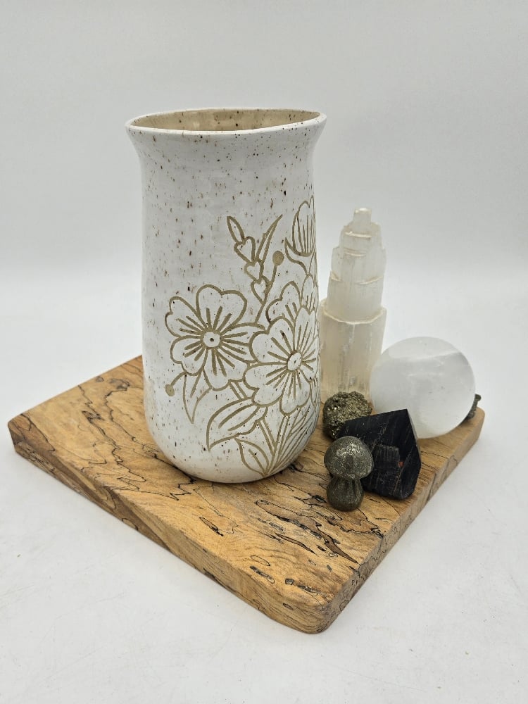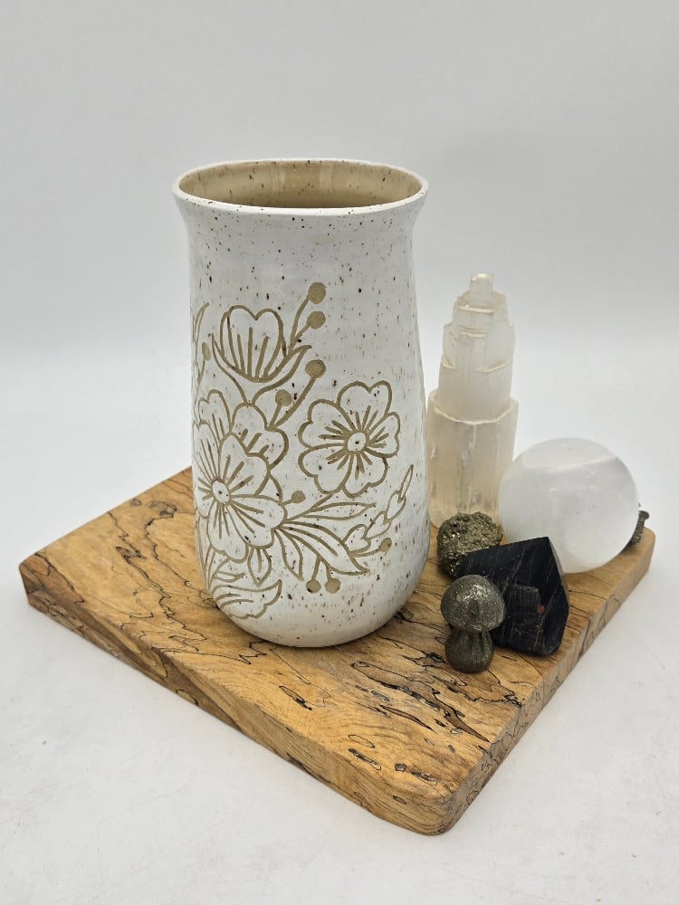 Handcrafted White and Tan Cosmo Vase 6inches tall, 3 inches wide at opening. Microwave and dishwasher safe.
