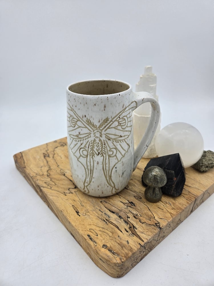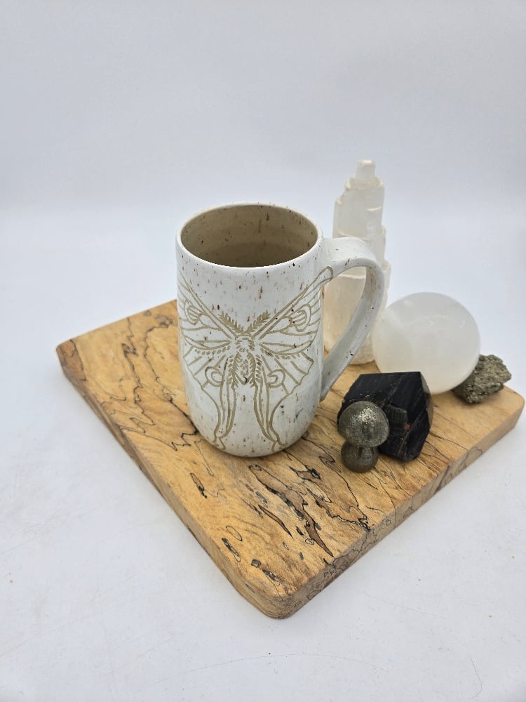 Handcrafted White and Tan Luna Moth Mug, holds approx 18oz. Microwave and dishwasher safe.