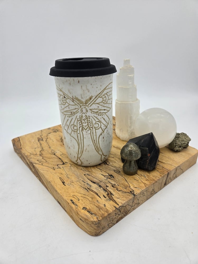 Handcrafted White and Tan Luna Moth Travel Mug, holds approx 20 oz. Microwave and dishwasher safe. Comes with Silicone Lid.