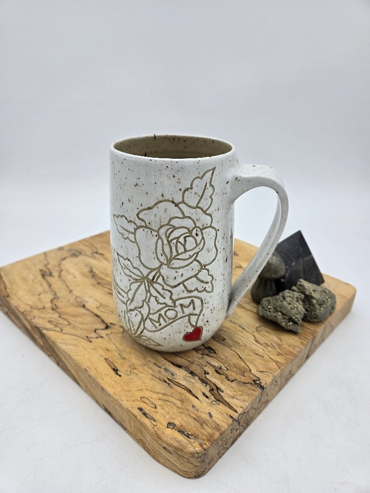 Handcrafted White and Tan Mom Rose Mug, holds approx 18oz. Microwave and dishwasher safe.
