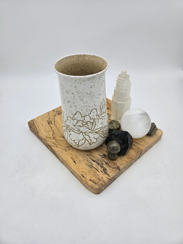Handcrafted white and tan Peony Vase, approx 9 inches tall, 4 inches wide at opening. Microwave and dishwasher safe.